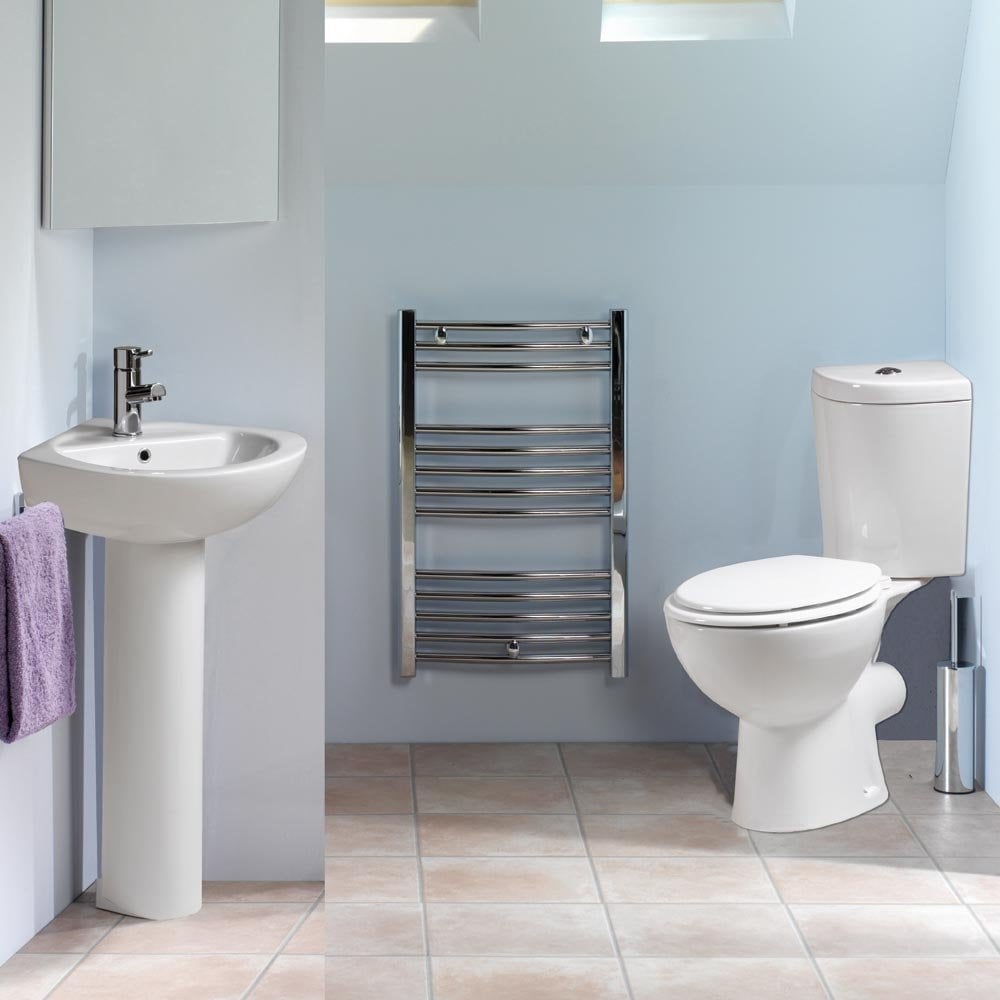 - 4-Piece Set includes Corner Pan, Soft Close Seat, Cistern, Basin & Pedestal